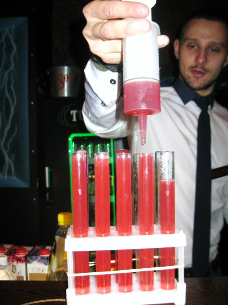 Особенно хочу отметить диско-бар LABOR – необычное место, в котором все напитки подаются в пробирках. Коктейли официант разливает из огромного шприца, прямо в медицинские пробирки и колбы.